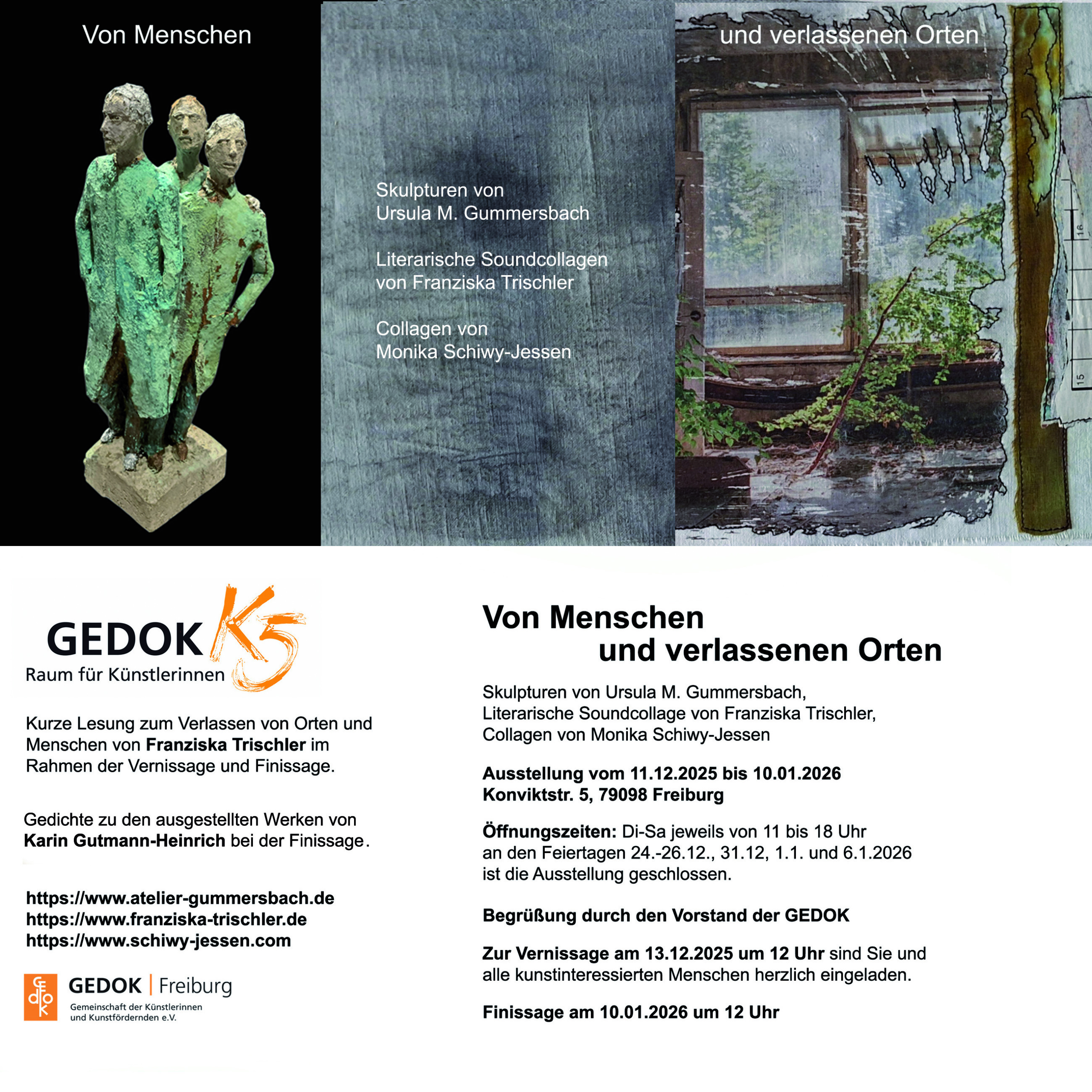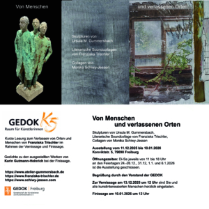13.12.2025, 12 Uhr: Vernissage der Ausstellung „von Menschen und verlassenen Orten“, zusammen mit U. Gummersbach (Bildhauerei) und M. Schiwy-Jessen (Tetxilkunst)